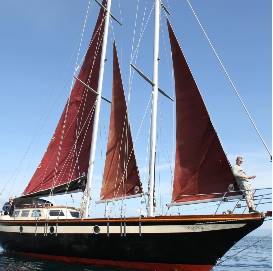 **Sailing the “Black Lady” is a unique experience, thanks to its schooner rigging, which provides a distinctive and enjoyable sailing dynamic. Equipped with state-of-the-art electronic navigation systems, the “Black Lady” ensures safe and precise voyages, even in the challenging conditions of the Faroe Islands, the North Atlantic, and the North Sea.**
